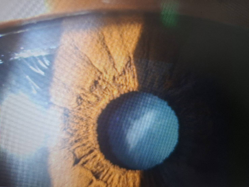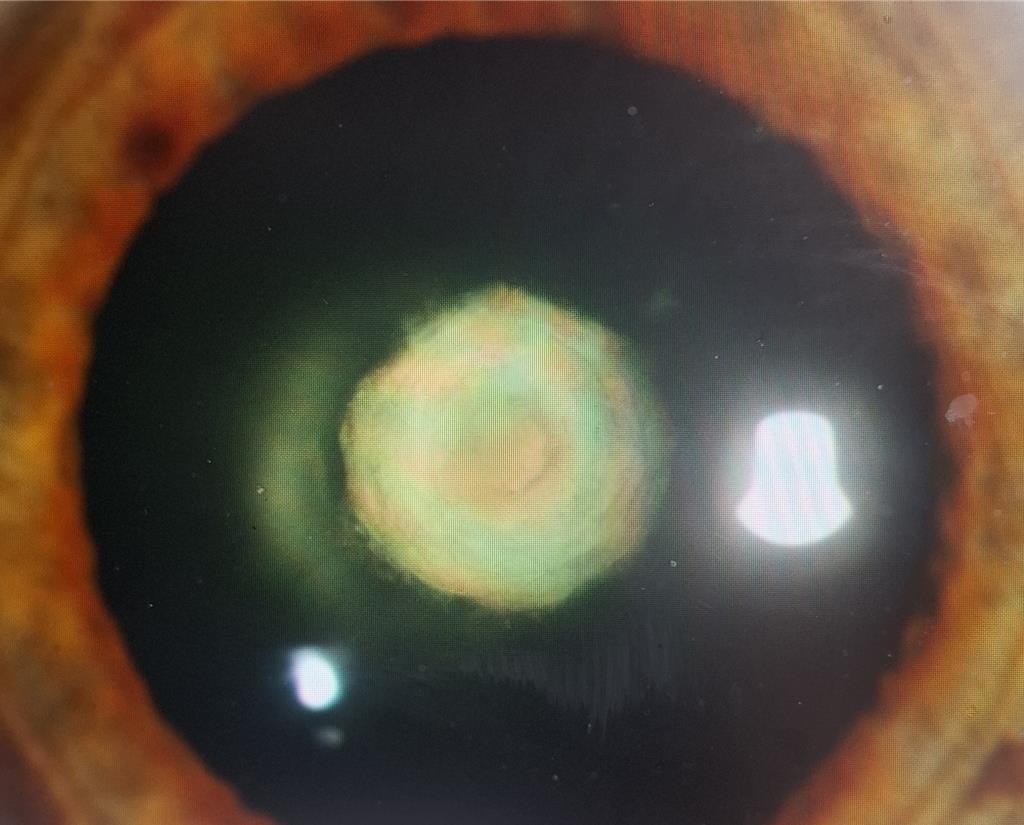 手術後,整個白內障已被移除,台灣島的形狀已經消失,而被人工水晶體取代。(洪啟庭提供)
