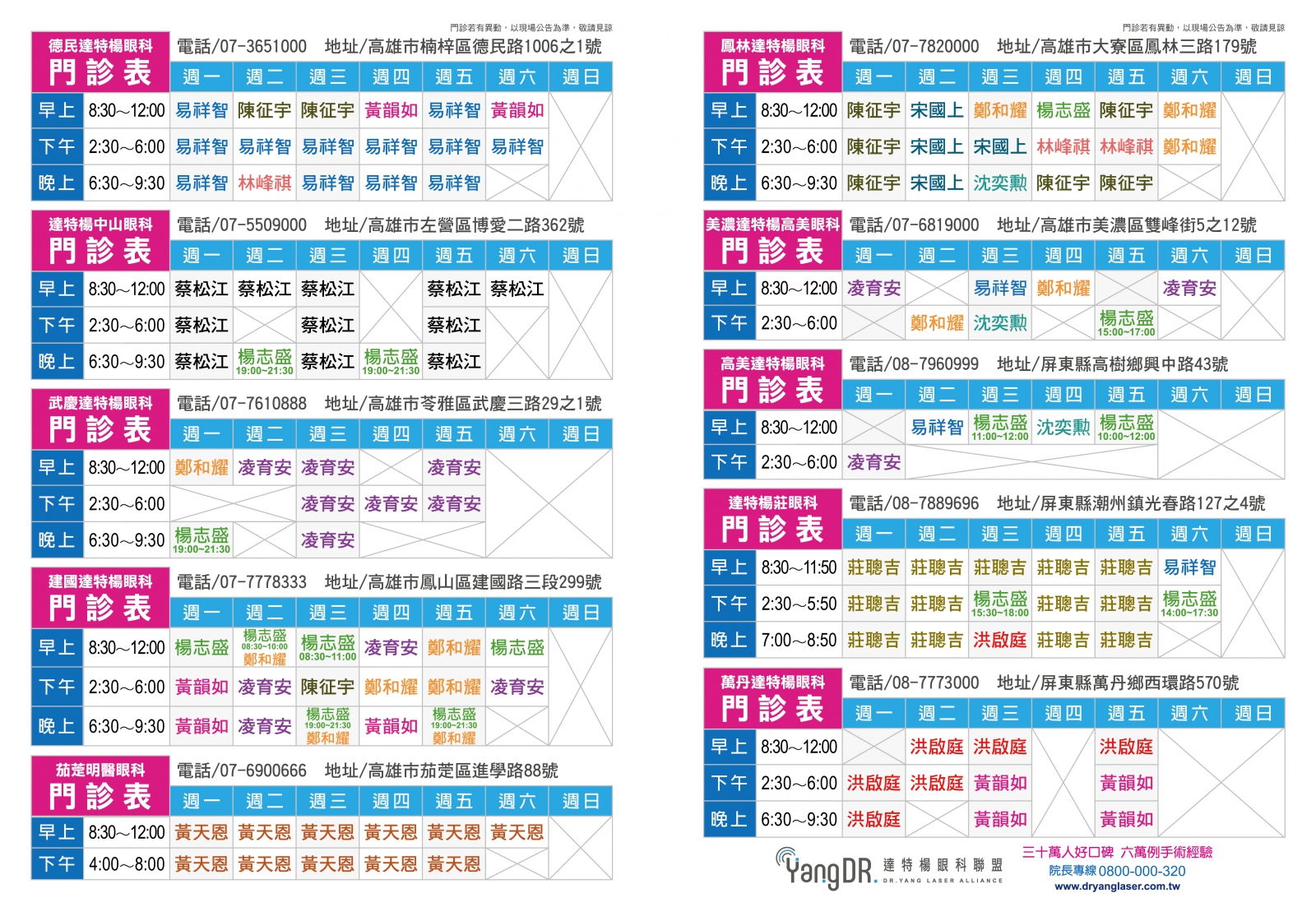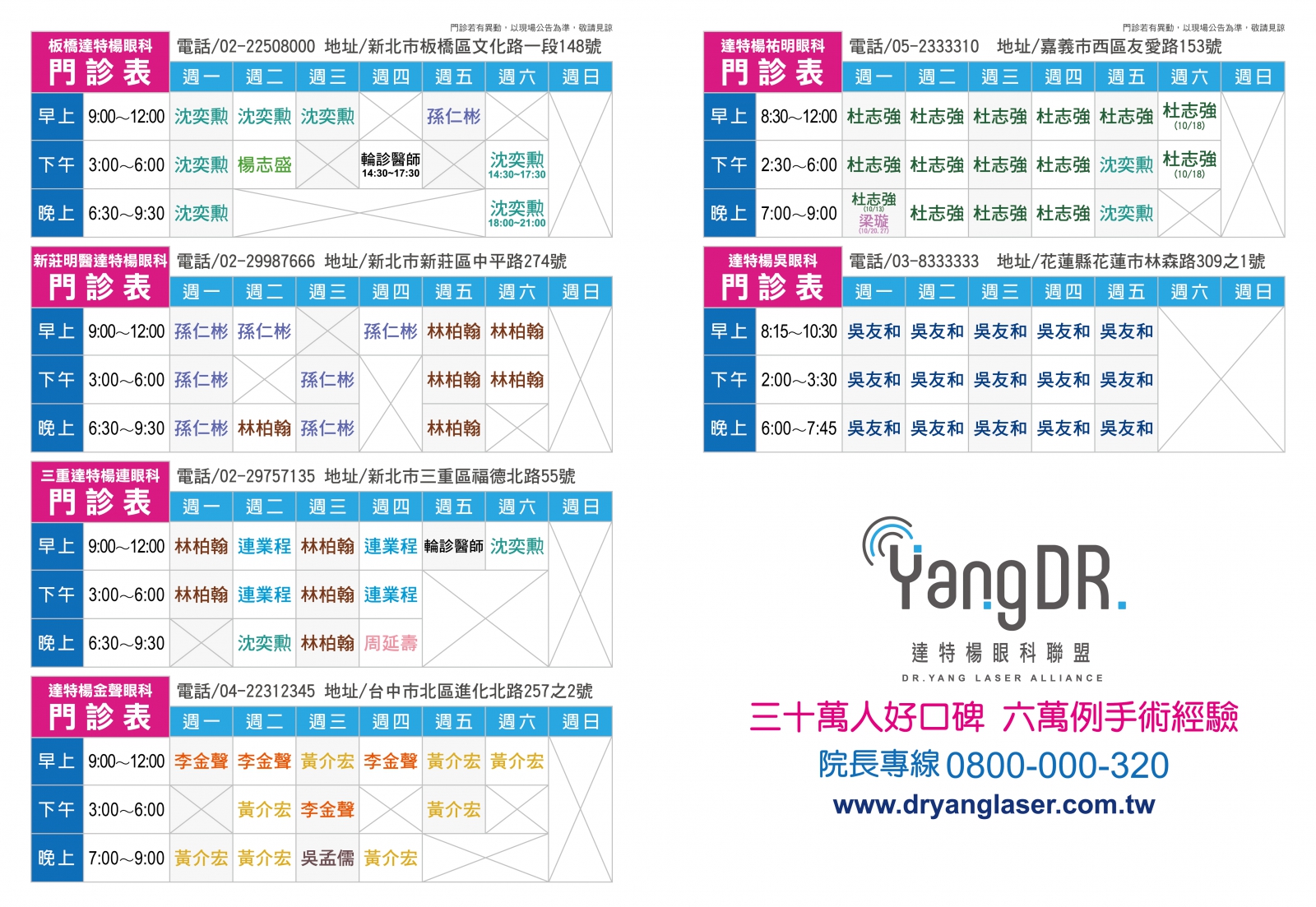 Home最新消息院所公告 2025-10-01 院所公告達特楊10月份一覽門診表 分享到Facebook 分享到LINE 複製此頁連結 ※ 門診情形若有異動,以現場公告為主,敬請見諒 ※ 2025-10-02 🏀【職籃球員 史承平 700度近視OUT❗️】制勝1.5關鍵好視力 2025-10-07 🎉🇹🇼 雙十國慶休診公告🇹🇼 🎉 BACK