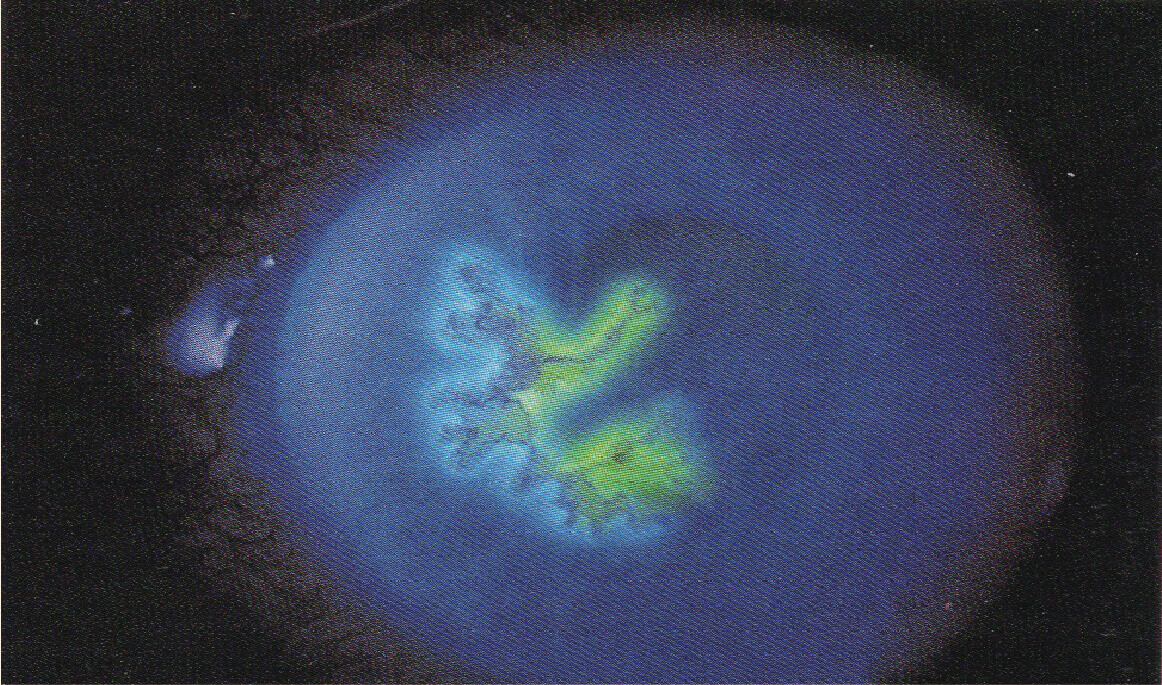 4.樹枝狀潰瘍偶爾會持續變大,形成更大的上皮缺損造成地圖狀或阿米巴圖形。不慎重地使用局部類固醇會造成病毒快速複製使這類病灶特別容易發生。